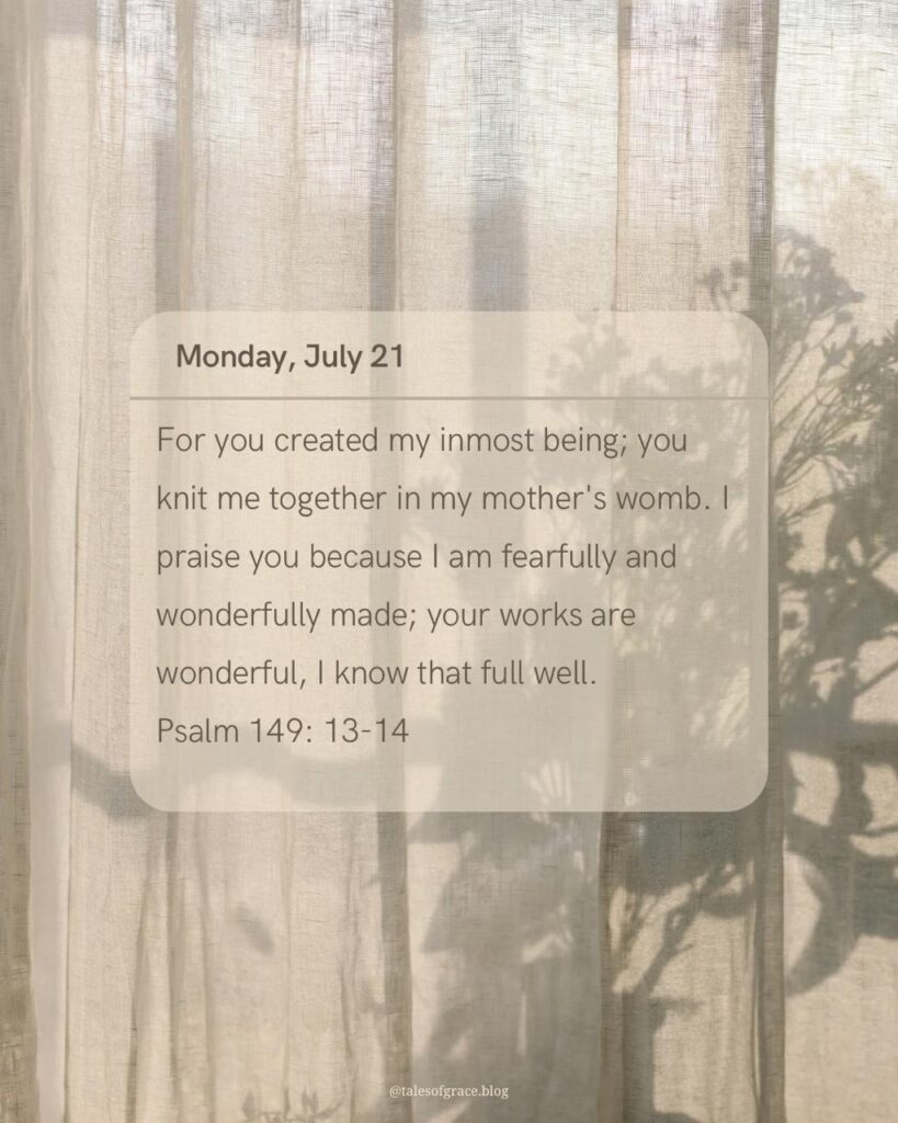 “You created my inmost being; you knit me together in my mother’s womb. I praise you because I am fearfully and wonderfully made.”